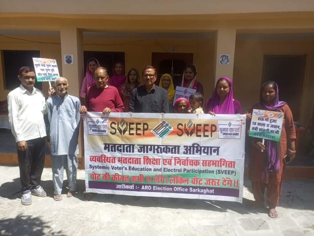 सरकाघाट 26 अप्रैल- आगामी लोकसभा चुनावों में लोगों की सकारात्मक भागीदारी सुनिश्चित बनाने के लिए प्रशासन लगातार नए युवा मतदाताओं और आम लोगों को वोट के प्रति जागरूक करने में जुटा है। इसी के दृष्टिगत 35-सरकाघाट विधानसभा क्षेत्र की समस्त पंचायतों व बूथों में स्वीप कार्यक्रम किए जा रहे हैं ताकि ज्यादा से ज्यादा मतदाता जागरूक हो सके और मतदान में लोगों की शत-प्रतिशत सहभागिता सुनिश्चित हो सके।