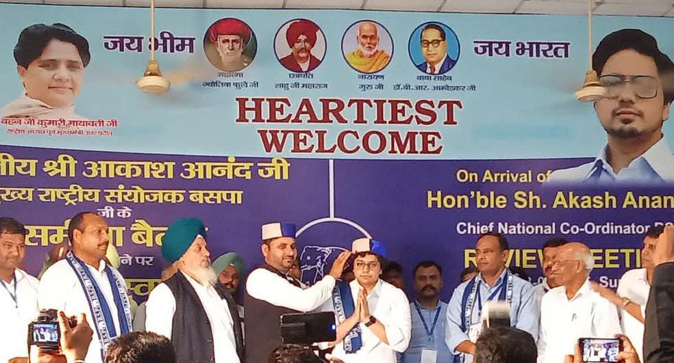 बसपा पार्टी की चंडीगढ़ के सेक्टर-29 के बाबा सोहन सिंह भकणा भवन के सभागार में आयोजित हरियाणा, हिमाचल प्रदेश और चंडीगढ़ प्रदेश इकाइयों की बैठक में उन्होंने पार्टी की मजबूती की समीक्षा की। आकाश आनंद बैठक में मुख्य अतिथि के रूप में शामिल हुए जबकि पार्टी के नेशनल कोआर्डिनेटर रणधीर सिंह बेनीवाल विशिष्ट अतिथि के रूप में उपस्थित रहे। इस अवसर पर पहाड़ी नीली टोपी पहनाकर मुख्य अतिथि आकाश आनंद और विशिष्ट अतिथि रणधीर सिंह बेनीवाल का हिमाचली पारंपरिक तरीके से पदाधिकारियों ने भारी उत्साह से अभिनंदन किया।