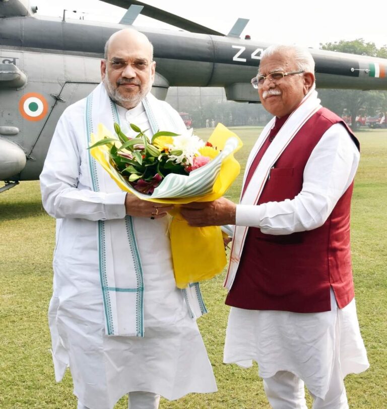 हरियाणा सरकार के 9 वर्ष पूरे होने के उपलक्ष्य में करनाल में आयोजित अंत्योदय महासम्मेलन में पहुंचने पर केंद्रीय गृह...