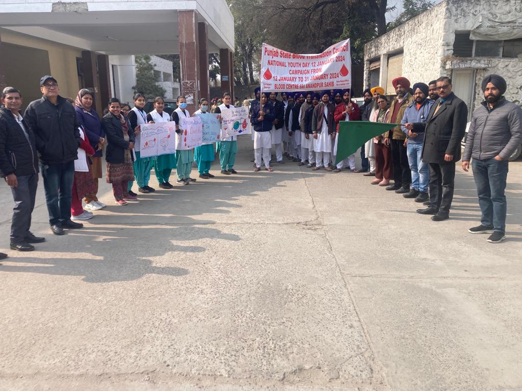 पंजाब स्टेट एज कंट्रोल सोसायटी के आदेशानुसार 12 जनवरी से 31 जनवरी तक राष्ट्रीय युवा पखवाड़ा स्थानीय भाई जैताजी सिविल अस्पताल श्री आनंदपुर साहिब में मनाने के निर्देश दिए गए।डॉ। वरिष्ठ चिकित्सा अधिकारी चरणजीत कुमार के निर्देशानुसार ब्लड सेंटर में डॉ. पद्मश्री प्रोफेसर करतार सिंह, गुरुमीत संगीत विद्यालय और डॉ. दयाल सिंह मेमोरियल स्कूल ऑफ नर्सिंग के विद्यार्थियों द्वारा युवा दिवस के अवसर पर जागरूकता रैली निकाली गई। सिविल अस्पताल श्री आनंदपुर साहिब में पोस्टर मेकिंग मुकाबले करवाए गए।रक्त आधान अधिकारी डॉ. मनप्रीत कटारिया ने विद्यार्थियों को रक्तदान के महत्व के बारे में प्रोत्साहित करते हुए कहा कि रक्तदान सर्वोत्तम दान है, दान किए गए रक्त से कई अनमोल जिंदगियां बचाई जा सकती हैं। रक्तदान करने से शरीर स्वस्थ रहता है। उन्होंने कहा कि जो भी रक्त दान किया जाता है, उसकी पूर्ति 24 घंटे के अंदर शरीर में स्वत: हो जाती है।उन्होंने विद्यार्थियों को नशे के दुष्परिणामों से अवगत करवाया और नशे से दूर रहने के लिए प्रेरित किया। इस अवसर पर एसएमओ द्वारा गुरुमीत संगीत विद्यालय एवं नर्सिंग स्कूल के विद्यार्थियों को सम्मानित किया गया तथा गुरुमीत संगीत विद्यालय के प्रभारी स. सुखविंदर सिंह को भी सम्मानित किया गया।इस अवसर पर डॉ. रणवीर सिंह, डॉ. केपी सिंह, डॉ. सुनैना गुप्ता, डॉ. सुचिना परमार, डॉ. राजेश कुमार, राणा बख्ताबर सिंह, नीरज शर्मा, सुरिंदरपाल सिंह, अनीता, आराधना, मोनिका, जगदीप सिंह, सोनू, मोहनलाल सहित समस्त स्टाफ उपस्थित था