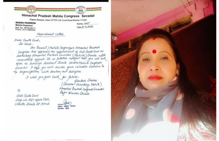 देश राज शर्मा, शिमला, हिमाचल प्रदेश महिला कांग्रेस सेवादल की प्रदेश अध्यक्षा रीना पंडिर ने लोकसभा चुनावों से पहले आज...
