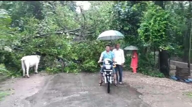 संजीव डोगरा, दौलतपुर चौक,शनिवार को हुई भारी बारिश में क्षेत्र के पिरथीपुर जोह सम्पर्क सड़क पर एक पेड़ गिर गया...