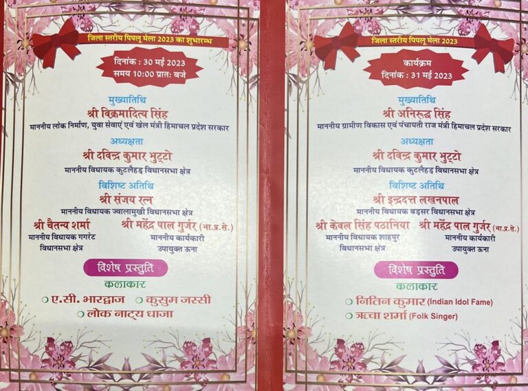 अजय शर्मा, ऊना, ऊना जिला के उपमंडल बंगाणा में जिला स्तरीय पिपलू मेला 2023 का आयोजन 30 मई से 1...