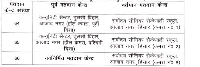 यह जानकारी देते हुए 53-नलवा विधानसभा क्षेत्र की रिटर्निंग अधिकारी एवं अतिरिक्त उपायुक्त सी जयश्रद्घा ने बताया कि विधानसभा क्षेत्र में 64 से 66 मतदान केंद्रों में बदलाव किया गया है। उन्होंने बताया कि मतदान केंद्र संख्या 64 को कम्युनिटी सेंटर, तुलसी विहार, आजाद नगर (हॉल कमरा, पूर्वी दिशा) से सर्वोदय सीनियर सैकेंडरी स्कूली आजाद नगर (कमरा नंबर-1) में, मतदान केंद्र संख्या 65 को कम्युनिटी सेंटर, तुलसी विहार, आजाद नगर (हॉल कमरा, पश्चिमी दिशा) से सर्वोदय सीनियर सैकेंडरी स्कूली आजाद नगर (कमरा नंबर-2) में तथा मतदान केंद्र संख्या 66 को नवनिर्मित मतदान केंद्र से सर्वोदय सीनियर सैकेंडरी स्कूली आजाद नगर (कमरा नंबर-8) में स्थानांतरित किया गया है।