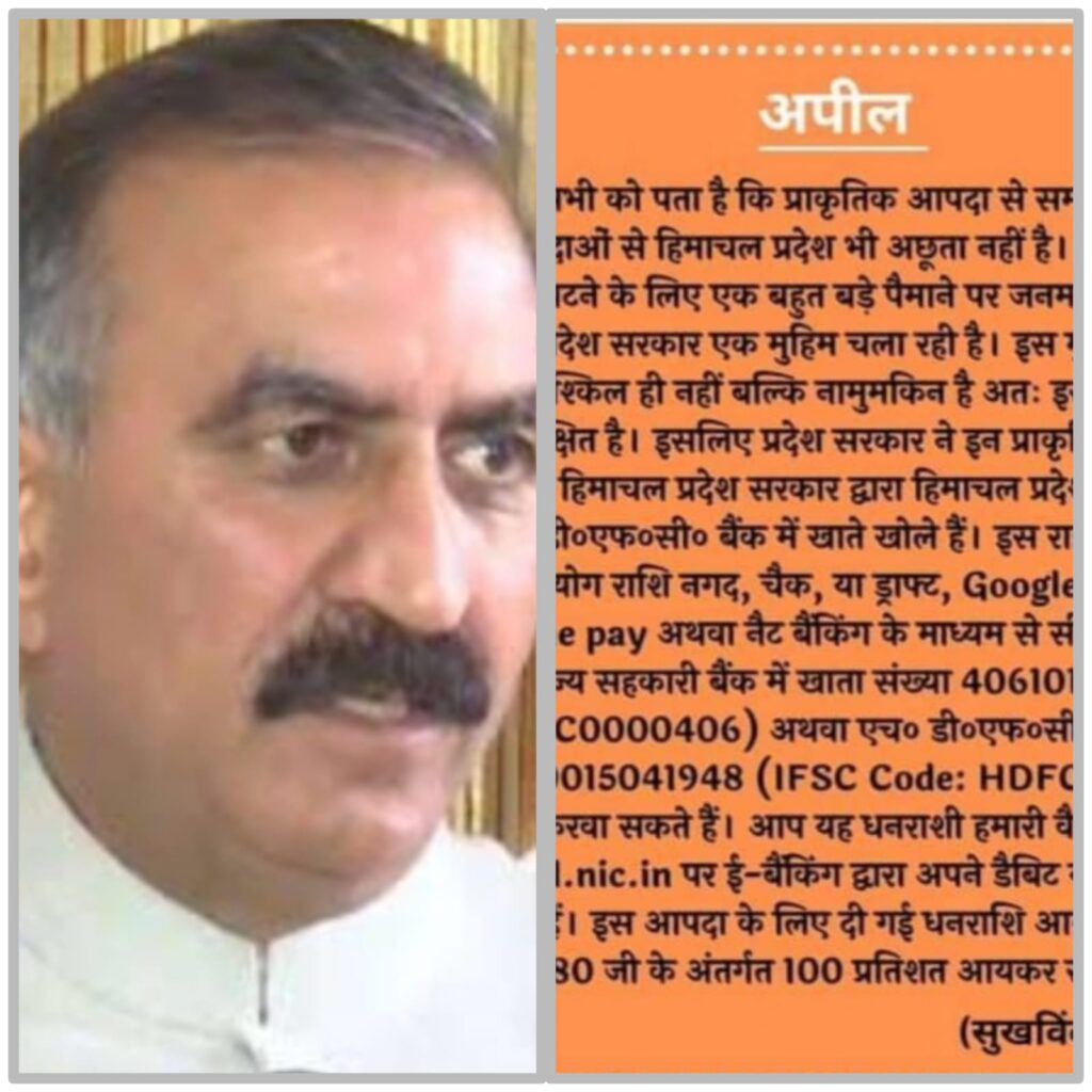 मुख्यमंत्री सुखविंदर सिंह सुक्खू ने हिमाचल प्रदेश में प्राकृतिक आपदा से हुई तबाही से निपटने के लिए आम जनता से सहयोग की अपील की है। उन्होंने कहा है कि इन प्राकृतिक आपदाओं से निपटने के लिए प्रदेश सरकार बड़े पैमाने पर जनमानस से सहयोग हेतु मुहिम चला रही है। इस मुहिम को सफल बनाना आम जनमानस के सहयोग के बिना संभव नहीं है। अतः इसमें जनता का सहयोग अपेक्षित है। इसलिए प्रदेश सरकार ने इन प्राकृतिक आपदाओं से निपटने के लिए हिमाचल प्रदेश सरकार द्वारा हिमाचल प्रदेश राज्य सहकारी बैंक और एचडीएफसी बैंक में खाता खोले हैं। इस राहत कोष के लिए आम लोग अपनी सहयोग राशि नगद, चेक, या ड्राफ्ट, गूगल पे, आरटीजीएस, एनईएफटी, फोन पे, अथवा नेट बैंकिंग के माध्यम से सीधा छोटा शिमला स्थित हिमाचल प्रदेश राज्य सहकारी बैंक में खाता संख्या 40 6101 07381(IFSC code HPSC 0000406 ), एचडीएफसी बैंक के खाता संख्या 99990015041948 (IFSC code HDFC0004116) में जमा करवा सकते हैं। यह धनराशि सरकार की वेबसाइट cmhimachal.nic.in पर ई बैंकिंग द्वारा अपने डेबिट या क्रेडिट कार्ड से भी भेज सकते हैं।इस आपदा के लिए दी गई धनराशि आयकर अधिनियम की धारा 80 जी के अंतर्गत 100 प्रतिशत आयकर से मुक्त है।