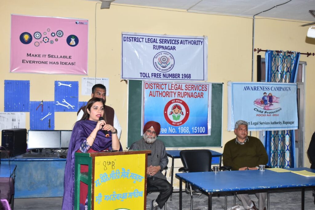 जिला एवं सत्र न्यायाधीश सह-अध्यक्ष जिला कानूनी सेवा प्राधिकरण रूपनगर के निर्देशन में मुख्य न्यायिक मजिस्ट्रेट सह-सचिव जिला कानूनी सेवा प्राधिकरण रूपनगर सुश्री हिमांशी गल्होत्रा सरकारी कन्या वरिष्ठ माध्यमिक विद्यालय श्री आनंदपुर साहिब में एक विशेष सेमिनार का आयोजन किया गया इस सेमिनार में स्कूली छात्रों और शिक्षकों को बच्चों और महिलाओं के मौलिक अधिकारों और पोक्सो एक्ट के बारे में जागरूक किया गया ताकि बच्चों के साथ बढ़ते शारीरिक शोषण के प्रति जागरूक किया जा सके। उन्होंने बच्चों को यह भी बताया कि बच्चों को यौन शोषण से बचाने और ऐसी अवांछित घटना होने पर सख्त कार्रवाई करने के लिए POCSO के लिए यौन अपराधों से बच्चों का संरक्षण अधिनियम, 2012 कानून बनाया गया है।अंत में सीजेएम श्रीमती हिमांशी गल्होत्रा ने कहा कि जिला विधिक सेवा प्राधिकरण से बात करने के लिए किसी भी समय टोल फ्री नंबर 15100 पर संपर्क कर सकते हैं।