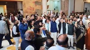 नई दिल्ली: संसद के शीतकालीन सत्र के 18 वें दिन बुधवार को डॉ. अंबेडकर पर गृह मंत्री अमित शाह के बयान को लेकर कांग्रेस सांसदों ने हंगामा किया। कांग्रेस ने लोकसभा और राज्यसभा में इस मुद्दे को लेकर हंगामा किया। कांग्रेस सांसदों ने आरोप लगाया कि गृह मंत्री शाह के बयान से बाबा साहब डॉ. भीमराव अंबेडकर का अपमान हुआ है। इस मुद्दे पर कांग्रेस और भाजपा के बीच तीखी नोकझोंक हुई। कांग्रेस सांसदों ने जय भीम के नारे लगाए। भाजपा ने इसे “ढोंग” करार दिया। इसे लेकर पहले लोकसभा और फिर राज्यसभा की कार्यवाही दोपहर 2 बजे तक स्थगित कर दी गई।