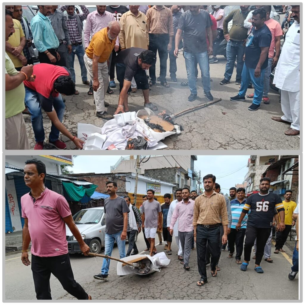 जिला ऊना के मैहतपुर में डॉक्टर द्वारा भगवान शिव पर अभद्र टिप्पणी मामले को लेकर अब हिंदू संगठनों का गुस्सा लगातार बढ़ता जा रहा है। वीरवार को व्यापार मंडल अध्यक्ष के आह्वान पर व्यापारियों ने अपने व्यपारिक प्रतिष्ठान बंद रख रोष रैली निकाल कर डॉक्टर नदीम अखतर का पुतला फूंका और प्रशासन से डॉक्टर की जल्द गिरफ्तारी की मांग उठाई। बता दे कि ऊना के मैहतपुर में एक डॉक्टर द्वारा भगवान शिव के खिलाफ अभद्र टिप्पणी से हिन्दू संगठनों का गुस्सा सातवे आसमान पर है और हिन्दू संगठनों की पुलिस प्रशसन से मांग है कि उक्त डॉक्टर के खिलाफ कड़ी कार्यवाही करते हुए उसे गिरफ्तार किया जाए ।इसी कड़ी में वीरवार को दौलतपुर बाज़ार एक बजे तक बंद कर व्यपारियो ने अपने कारोबार बंद रख कर अपना विरोध दर्ज करवाया। इस मौके पर दौलतपुर बस स्टैंड में व्यपारियो ने इक्कठा हो कर मुख्य चौक तक एक रैली निकाली व ड़ा नदीम अख्तर का पुतला जलाया। इस मौके पर व्यापार मंडल प्रधान राजीव राजू व वरिष्ठ व्यापारी सतीश शर्मा ने कहा कि इस मामले में सरकार व प्रसाशन से कड़े कदम उठाने की मांग की है। उन्होंने कहा कि इस तरह समाज मे जहर फैलाने वाले असमाजिक तत्वों के खिलाफ कार्यवाही की जाए। उन्होंने कहा इस तरह के असमाजिक तत्वों पर दवा विक्रेताओं के बंद के समर्थन पर मरीज दवा के लिये भटकते नजर आये। भगवान शिव पर अभद्र टिप्पणी मामले को लेकर वीरवार को बंद के आह्वान पर दवा दुकानों के बंद होने पर मरीज दवाओं के लिए भटकते नजर आए वही हलवाई व सब्जी बिक्रेताओं ने अपनी दुकानें बंद रख कर अपना विरोध दर्ज करवाया ।