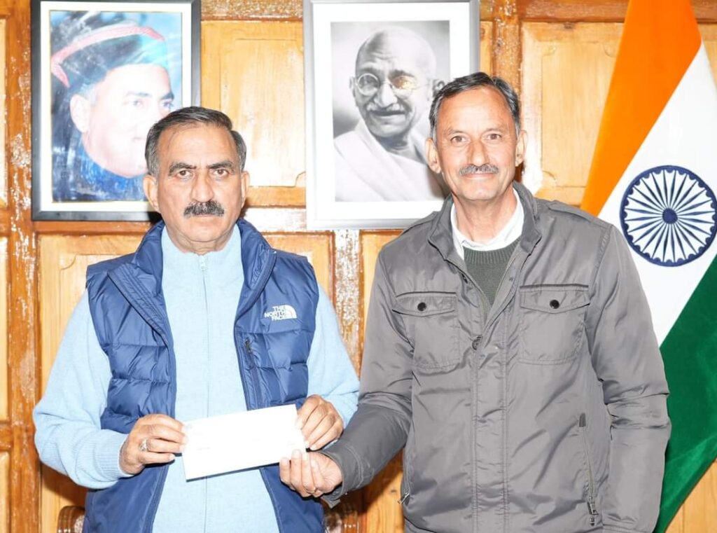 मोहित कांडा,, डॉ. यशवंत सिंह परमार बागवानी एवं वानिकी विश्वविद्यालय नौणी के सेवानिवृत्त डीन डॉ. नरेंद्र शर्मा ने आज शिमला में मुख्यमंत्री ठाकुर सुखविंदर सिंह सुक्खू को आपदा राहत कोष के लिए एक लाख रुपए का चेक भेंट किया। मुख्यमंत्री ने इस पुनीत कार्य के लिए डॉ. नरेंद्र शर्मा का आभार व्यक्त किया है।
