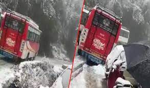 जमी बर्फ के कारण एचआरटीसी बस खाई में गिरने से बच गई