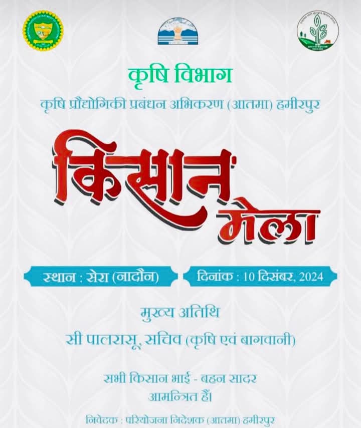 हमीरपुर 09 दिसंबर। कृषि विभाग के अंतर्गत कृषि प्रौद्योगिकी प्रबंधन अभिकरण (आतमा) हमीरपुर मंगलवार 10 दिसंबर को नादौन उपमंडल के गांव सेरा में किसान मेले का आयोजन करने जा रही है।