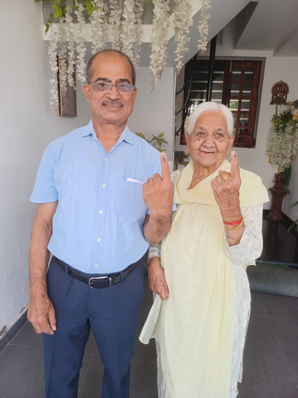 मतदान करने के बाद अंगुली पर लगी स्याही का निशान दिखाते हुए इं. कृष्ण कान्त सूद व उनकी माता जी