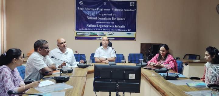 हमीरपुर 04 अक्तूबर। राष्ट्रीय महिला आयोग ने राष्ट्रीय विधिक सेवाएं प्राधिकरण (नालसा) के सहयोग से शुक्रवार को यहां हमीर भवन में विधिक जागरुकता कार्यक्रम ‘विधान से समाधान’ आयोजित किया। इसकी अध्यक्षता उपमंडलीय विधिक सेवाएं समिति हमीरपुर के अध्यक्ष एवं मुख्य न्यायिक दंडाधिकारी सूर्य प्रकाश ने की।