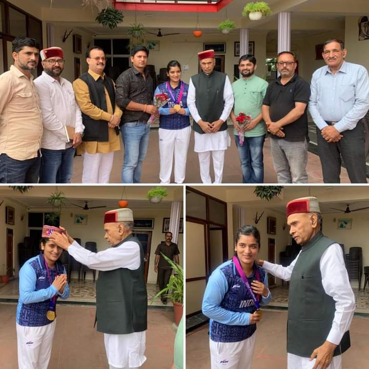 हमीरपुर,रजनीश, राष्ट्रीय कबड्डी खिलाड़ी सुषमा शर्मा ने शनिवार को पूर्व मुख्यमंत्री प्रेम कुमार धूमल से उनके निवास स्थान समीरपुर में पहुंचकर मुलाकात की। इस दौरान राष्ट्रीय खिलाड़ी ने पूर्व मुख्यमंत्री का आशीर्वाद प्राप्त किया और उनसे शिष्टाचार भेंट की। पूर्व मुख्यमंत्री ने हिमाचल की इस राष्ट्रीय कबड्डी खिलाड़ी का अपने घर पर आने पर स्वागत किया और हिमाचली शाल एवं टोपी के साथ-साथ समृति चिन्ह देकर सम्मानित किया। जानकारी देते हुए जिला भाजपा सचिव विनोद ठाकुर ने बताया कि सुषमा शर्मा पुत्री मदन सिंह जो राष्ट्रीय कबड्डी खिलाड़ी है, हिमाचल के शिलाई जिला सिरमौर की रहने वाली हैं। हाल ही में इस हिमाचल की होनहार बाला ने एशियाई गेम में शानदार प्रदर्शन करते हुए भारत को स्वर्ण पदक दिलाया है। इससे पहले वर्ष 2022 में राष्ट्रीय खेलो इंडिया खेल मुकाबले में नरेंद्र मोदी स्टेडियम अहमदाबाद में शानदार प्रदर्शन करते हुए गोल्ड मेडल जीत चुकी है। होनहार वाला की शिक्षा राजधानी शिमला से हुई है। प्रदेश विश्वविद्यालय एवं हिमाचल सरकार द्वारा कई बार नगद राशि एवं अन्य पुरस्कार देकर उसे सम्मानित किया जा चुका है। उन्होंने बताया कि सीनियर राष्ट्रीय ऑल इंडिया विश्वविद्यालय राष्ट्रीय खेल, खेलो इंडिया, इंडिया यूथ खेल विश्वविद्यालय प्रतियोगिता में भाग लेकर गोल्ड एवम सिल्वर मेडल जीत चुकी है। 2022 में आयोजित राष्ट्रीय खेल जिसका आयोजन नरेंद्र मोदी स्टेडियम अहमदाबाद में हुआ था वहां उसने गोल्ड मेडल जीतकर भारत का नाम रोशन किया था। हाल ही में चाइना में आयोजित एशिया गेम में शानदार प्रदर्शन करते हुए भारत के लिए गोल्ड मेडल जीता है। उन्होंने बताया कि वर्तमान में यह होनहार वाला सब इंस्पेक्टर के पद पर राजस्थान पुलिस में अपनी सेवाएं दे रही हैं। साक्षात्कार के दौरान सुषमा शर्मा ने बताया उनकी इस कामयाबी के पीछे उनके कोच संजीव ठाकुर और उनके परिजनों का पूरा सहयोग रहा है। इस मौके पर जिला भाजपा उपाध्यक्ष अभय लवली, सचिव विनोद ठाकुर, मंडल महामंत्री अशोक ठाकुर सहित भाई संत राम और अन्य लोग मौजूद रहे।