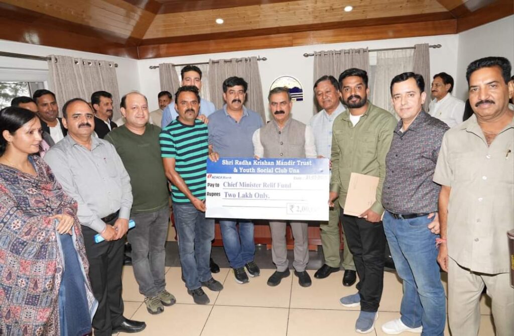 मुख्यमंत्री ठाकुर सुखविन्दर सिंह सुक्खू को आज शिमला में राधा कृष्ण मंदिर ट्रस्ट और यूथ सोशल क्लब ऊना ने मुख्यमंत्री आपदा कोष के लिए 371500 रुपये के चेक भेंट किए। मुख्यमंत्री ने इस पुनीत कार्य के लिए राधा कृष्ण मंदिर ट्रस्ट और यूथ सोशल क्लब ऊना का आभार व्यक्त किया।