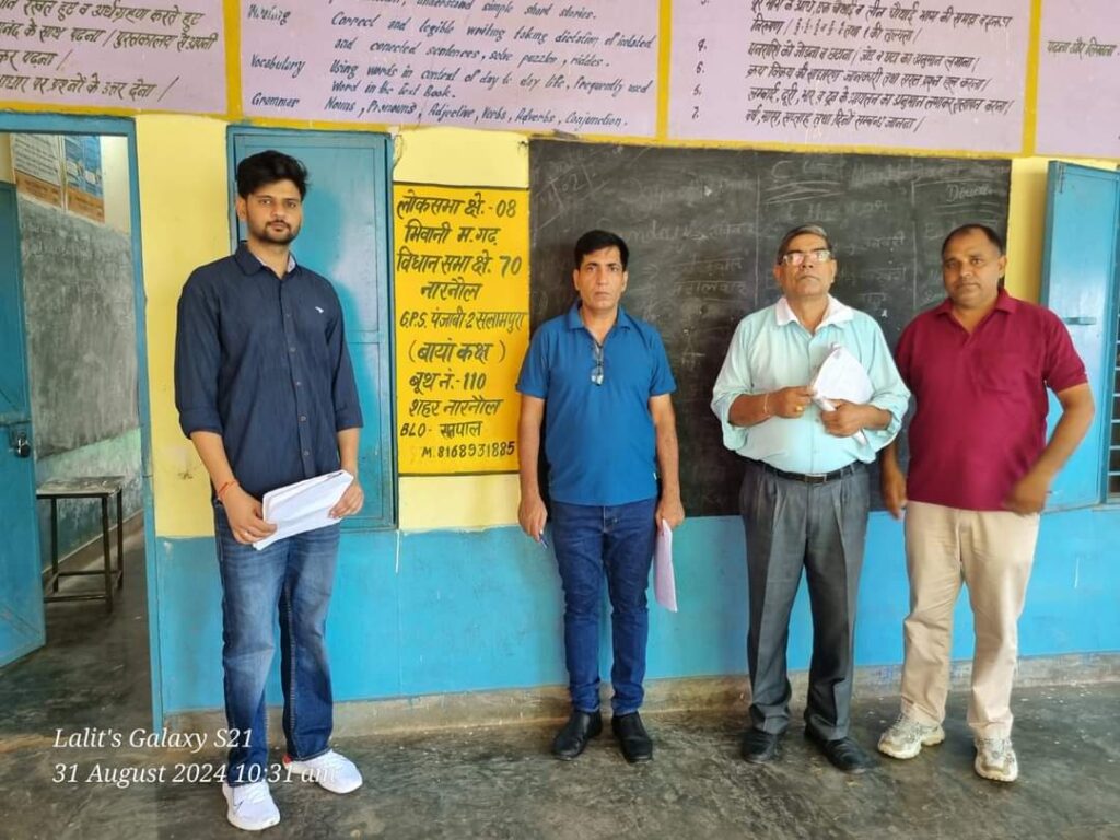 नारनौल, 31 अगस्त। हरियाणा विधानसभा आम चुनाव-2024 के मद्देनजर एसडीएम एवं नारनौल विधानसभा क्षेत्र के रिटर्निंग अधिकारी डा जितेंद्र सिंह ने आज नारनौल शहर तथा गांवों के विभिन्न मतदान केंद्रों का निरीक्षण किया। इस मौके पर उन्होंने मतदान केंद्रों पर मौजूद बीएलओ को आवश्यक दिशा निर्देश दिए।