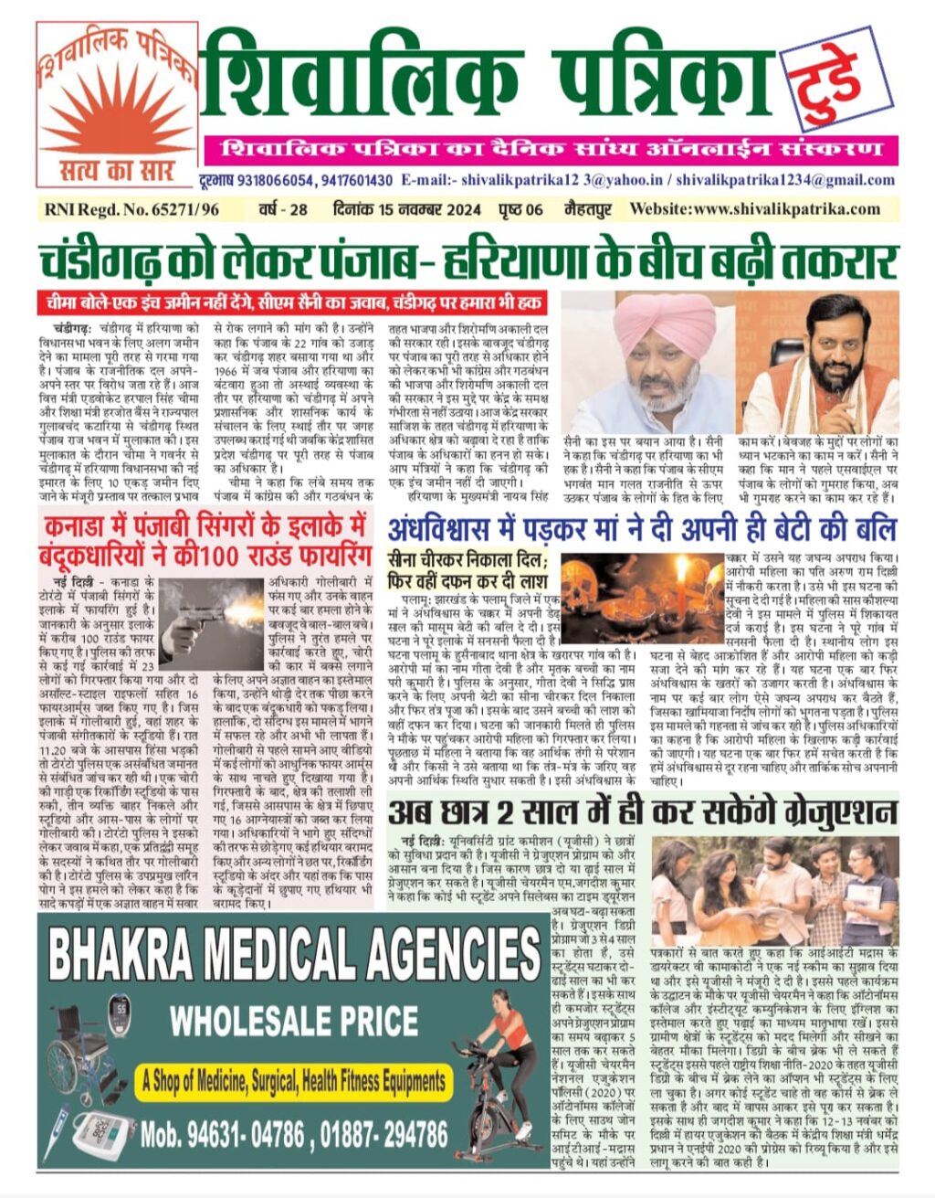 national Shivalik Patrika Evening 15 Nov. 2024 1 year ago shivalik-admin Post navigation Previous Shivalik Patrika Evening 15 Nov. 24Next चंडीगढ़ को लेकर पंजाब- हरियाणा के बीच बढ़ी तकरार
