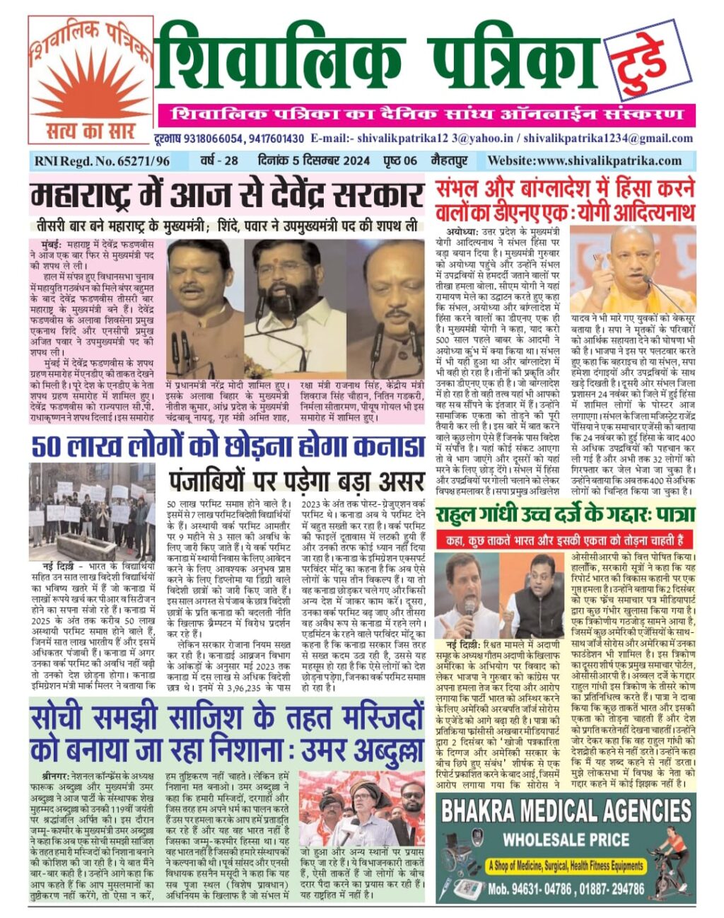 national Shivalik Patrika Evening e-paper 05 dec. 2024 1 year ago shivalik-admin Post navigation Previous चम्बा के मेडिकल कॉलेज में सर्जरी विभाग की टीम ने महिला के पेट से 3 किलो हाइडैटिड सिस्ट निकाल महिला को दिया नया जीवनNext देशभर में धमाल मचा रही पुष्पा 2