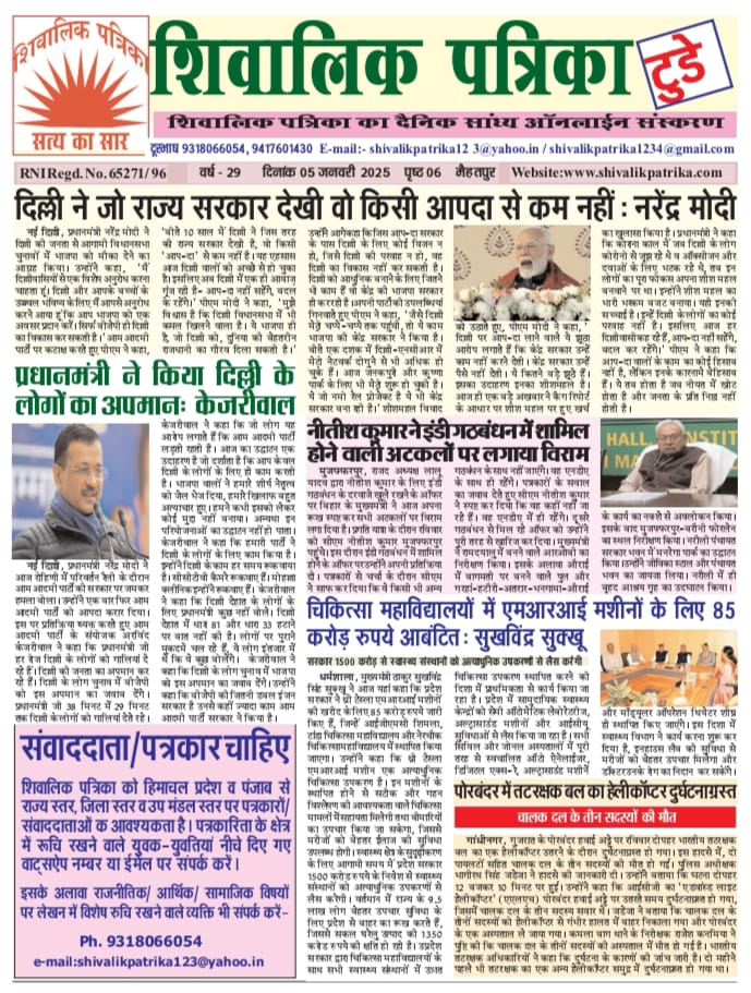 national Shivalik Patrika Evening e-paper 05 Jan. 2025 1 year ago shivalik-admin Post navigation Previous नीतीश कुमार ने इंडी गठबंधन में शामिल होने वाली अटकलों पर लगाया विरामNext भारत में एचएमपीवी वायरस का पहला केस आया सामने