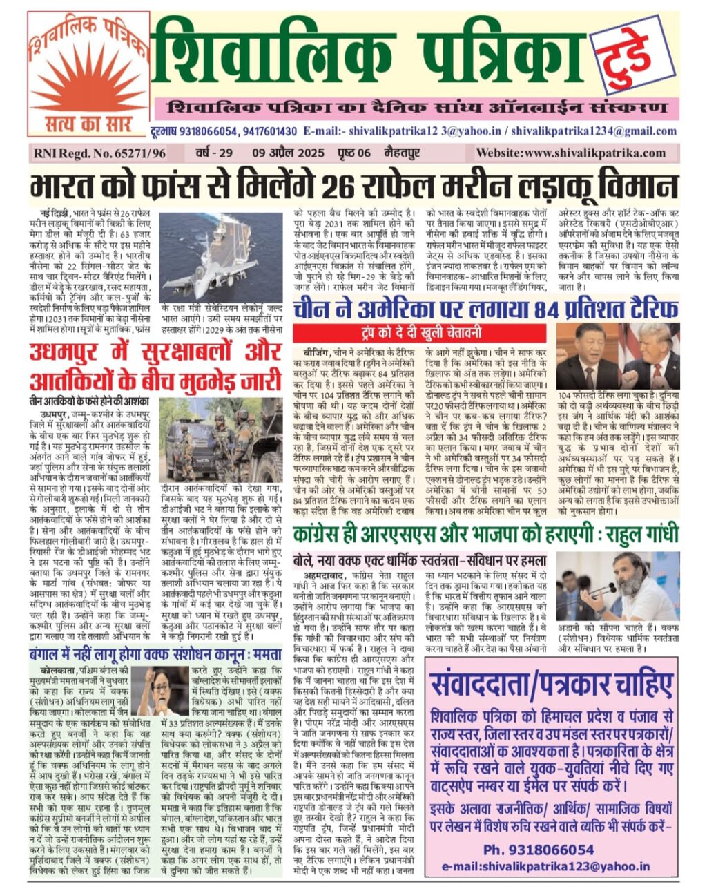 national Shivalik Patrika Evening e-paper 09 April 2025 9 months ago shivalik-admin Post navigation Previous साढ़े 3 साल की बच्ची के दुष्कर्म व हत्या मामले में दो दोषियों को फांसी की सजाNext औषधीय गुणों से भरपूर है लौंग, लेकिन गर्मियों में संभल कर करें इस्तेमाल