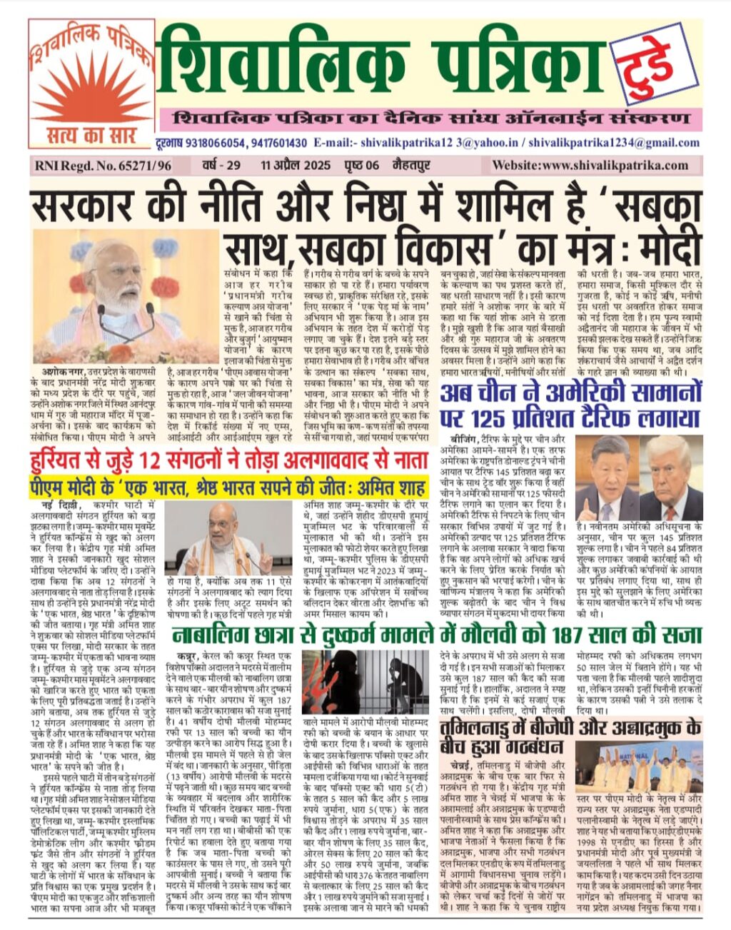 national Shivalik Patrika Evening e-paper 11 April 2025 9 months ago shivalik-admin Post navigation Previous तमिलनाडु में बीजेपी और अन्नाद्रमुक के बीच हुआ गठबंधनNext एसडीएम डॉ जितेंद्र सिंह ने किया अनाज मंडी का निरीक्षण