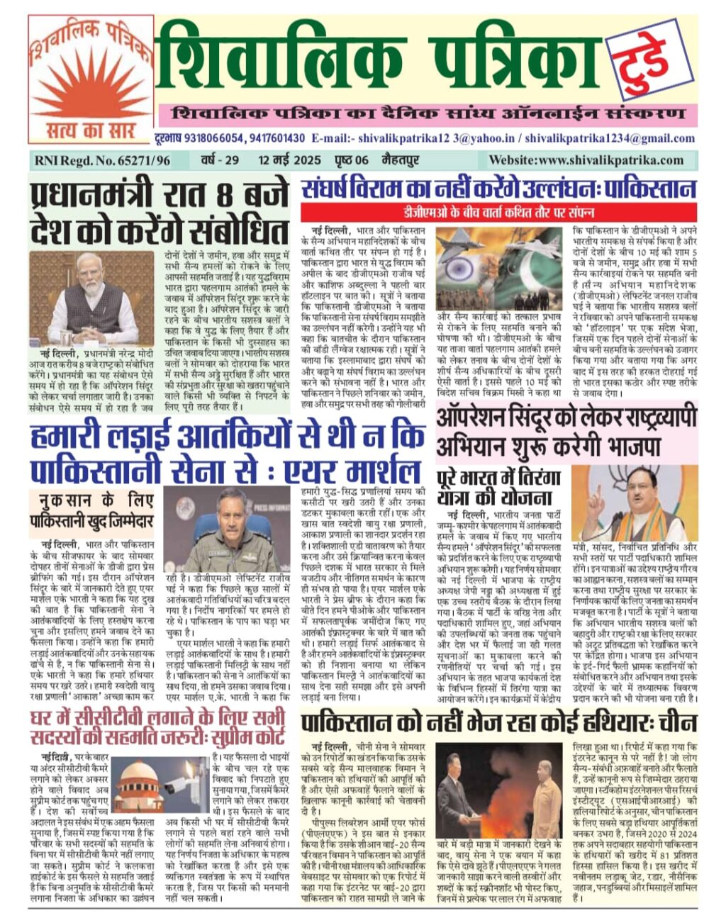 national Shivalik Patrika Evening e-paper 12 May 2025 7 months ago shivalik-admin Post navigation Previous घर में सीसीटीवी लगाने के लिए सभी सदस्यों की सहमति जरूरी: सुप्रीम कोर्टNext भाईचारा मजबूत होगा तो समाज करेगा तरक्कीः डॉ अरविंद शर्मा