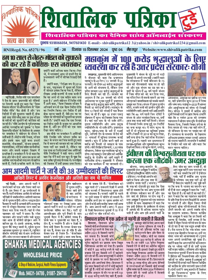 national Shivalik Patrika Evening e-paper 15 Dec. 2024 1 year ago shivalik-admin Post navigation Previous हिमाचल प्रदेश में एक अप्रैल से महंगी हो सकती है बिजलीNext गुणवत्तायुक्त सुविधाएं प्रदान करना प्रदेश सरकार का लक्ष्य: मुख्यमंत्री