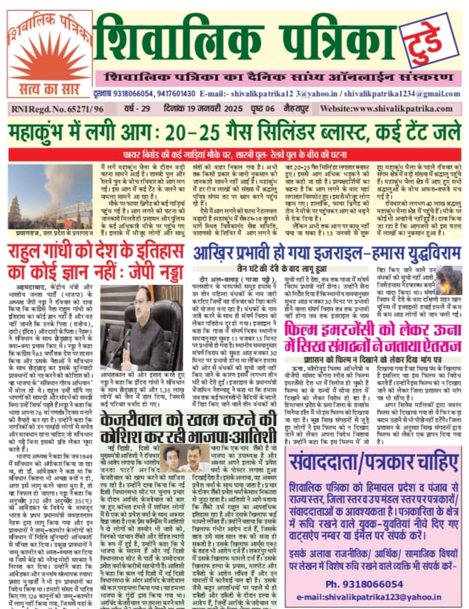 national Shivalik Patrika Evening e-paper 19 Jan. 2025 1 year ago shivalik-admin Post navigation Previous फिल्म इमरजेंसी को लेकर ऊना में सिख संगठनों ने जताया ऐतराजNext ग्राम पंचायत बवासनी के सुनानी गांव के पुनर्वास के लिए भूमि पूजन सम्पन्न