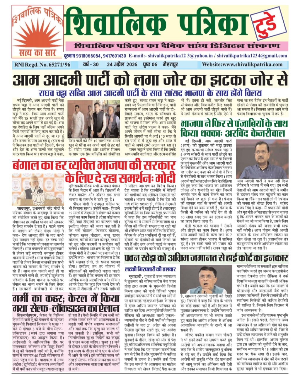 E-News Paper Shivalik Patrika Evening e-paper 24 April 2026 1 hour ago shivalik-admin Post navigation Previous गर्मी का कहर; केरल में किया गया सेल्फ-लॉकडाउन का ऐलान