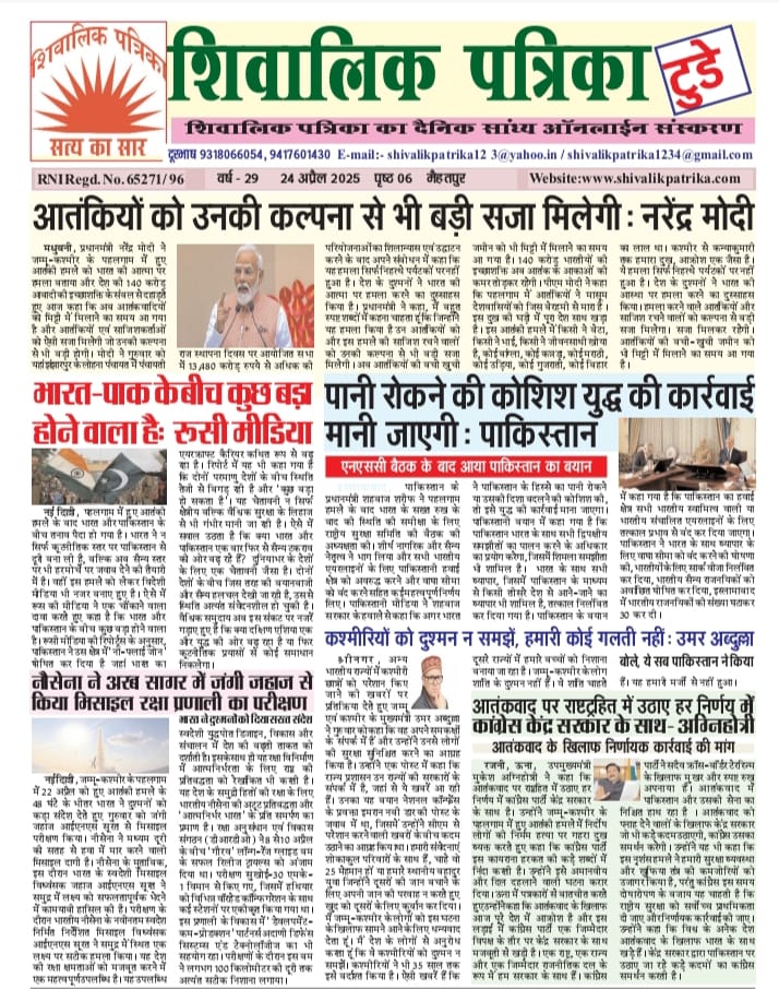 national Shivalik Patrika Evening e-paper 25 april 2025 8 months ago shivalik-admin Post navigation Previous आतंकी हमले को दो दिन नहीं बीते और भाजपा व सहयोगी चुनावी जनसभाओं में व्यस्त- संजीव गुलेरियाNext आईटीबीपी के सहयोग से प्रदेश में सीमा पर्यटन को दिया जाएगा बढ़ावा: मुख्यमंत्री