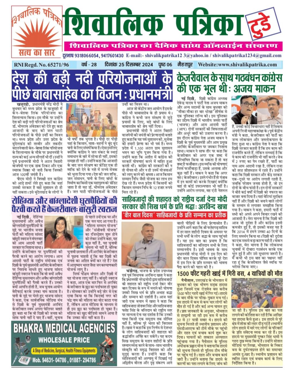 national Shivalik Patrika Evening e-paper 25 Dec. 2024 1 year ago shivalik-admin Post navigation Previous मुख्यमंत्री ने कोसली विधानसभा क्षेत्र में 23 करोड़ रुपये से अधिक लागत की कुल 6 परियोजनाओं का उद्घाटन व शिलान्यास कियाNext साहिबजादों की शहादत को राष्ट्रीय दर्जा देना मोदी सरकार की सिख धर्म के प्रति श्रद्धा: अरविन्द खन्ना