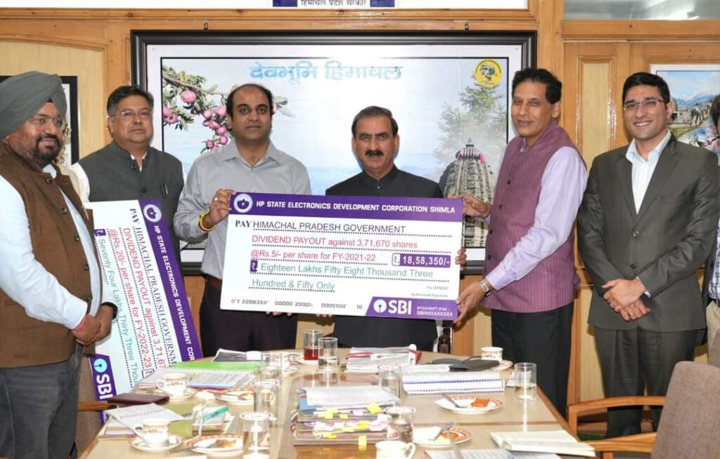 मुख्यमंत्री ठाकुर सुखविंदर सिंह सुक्खू ने शिमला में हिमाचल प्रदेश राज्य इलेक्ट्रॉनिक्स विकास निगम (एचपीएसईडीसी) के निदेशक मंडल की 106वीं बैठक की अध्यक्षता करते हुए निगम की उपलब्धियों की सराहना की। उन्होंने बताया कि एचपीएसईडीसी ने वित्त वर्ष 2022-23 में 200 करोड़ का रिकॉर्ड टर्नओवर और 8.16 करोड़ रुपए का शुद्ध लाभ अर्जित किया है। उन्होंने बताया कि निगम ने इतिहास में पहली बार सरकार को लाभांश का भुगतान किया है जिसके तहत वित्त वर्ष 2021-2022 के 18,58,350 रुपए और वित्त वर्ष 2022- 2023 के 74,33,400 रुपए का डेविडेंट सरकार को सौंपा।उन्होंने कहा के यह उपलब्धि निगम के समर्पण और प्रतिबद्धता को दर्शाता है। इसके अलावा मुख्यमंत्री ने आपदा प्रभावितों की सहायता के लिए निगम द्वारा आपदा राहत कोष में 21,00,000 रुपए के अंशदान के लिए भी उनका आभार व्यक्त किया है।